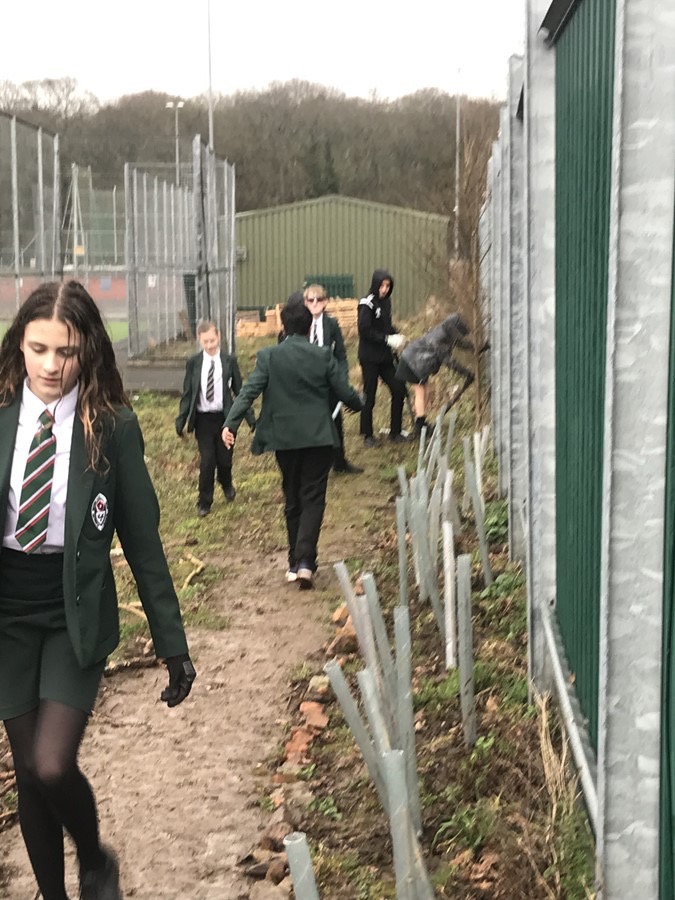 Students have designed a winding walk through trees and wild flowers to attract pollinators. Areas are being created for birds, hedgehogs and other wildlife which includes feeders and a shallow pond. Over 90 hedging and trees saplings have been planted so far from the Woodlands trust. Students have also purchased hedgehog homes, bird and bat boxes with funds raised through our pre-loved uniform sales. A small seating area at the end is also being created using donated items from the countryside centre too.